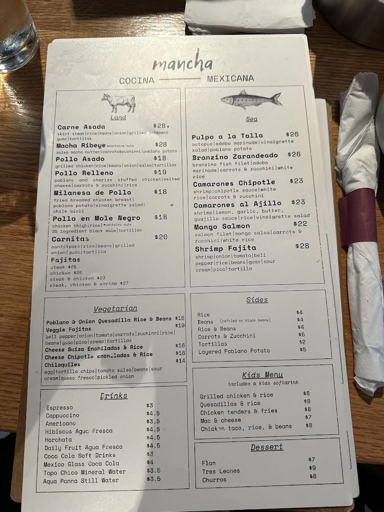 The menu at Mancha Cocina Mexicana is extensive and diverse. Each section highlights authentic Mexican dishes, from starters to desserts. Guests can share small plates like chips with salsa or queso dip. Tacos shine with choices ranging from carne asada to flavorful al pastor.